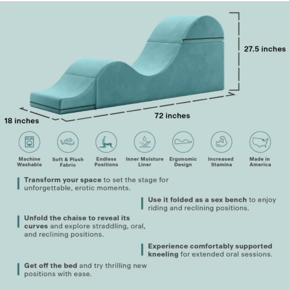 Meet the Aria Flip Chaise—a luxurious, position-enhancing bench that adapts to your body and your desires. With a convertible design that flips and folds into multiple curves, this shape-shifting chaise supports everything from classic intimacy to bold new angles.