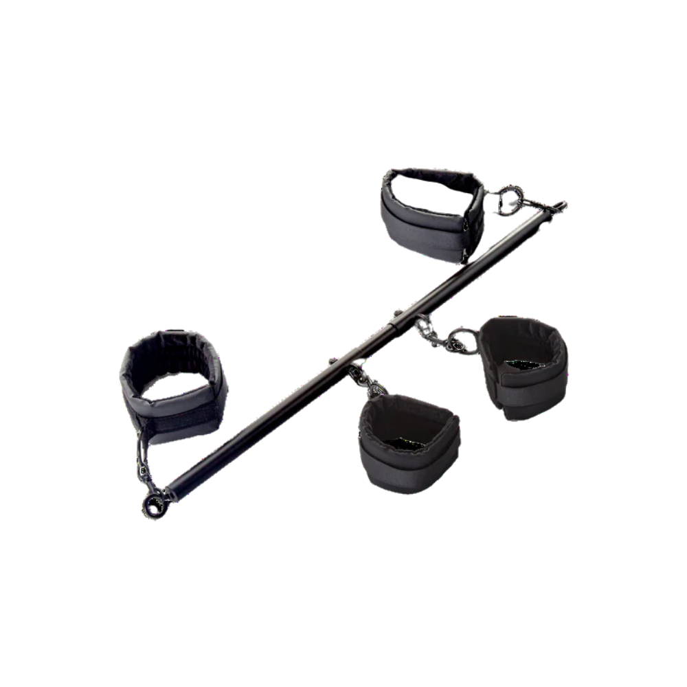 Submit to lust and bare it all with this bar set. The four included cuffs and expandable bar allow for simple control or a variety of compromising positions. Feel the soft cuffs against your skin as your partner tightens them around your wrist, ankles, or both. Give in to their control as the bar extends, holding you in place. Passion, power, and pleasure collide in an unparalleled experience.